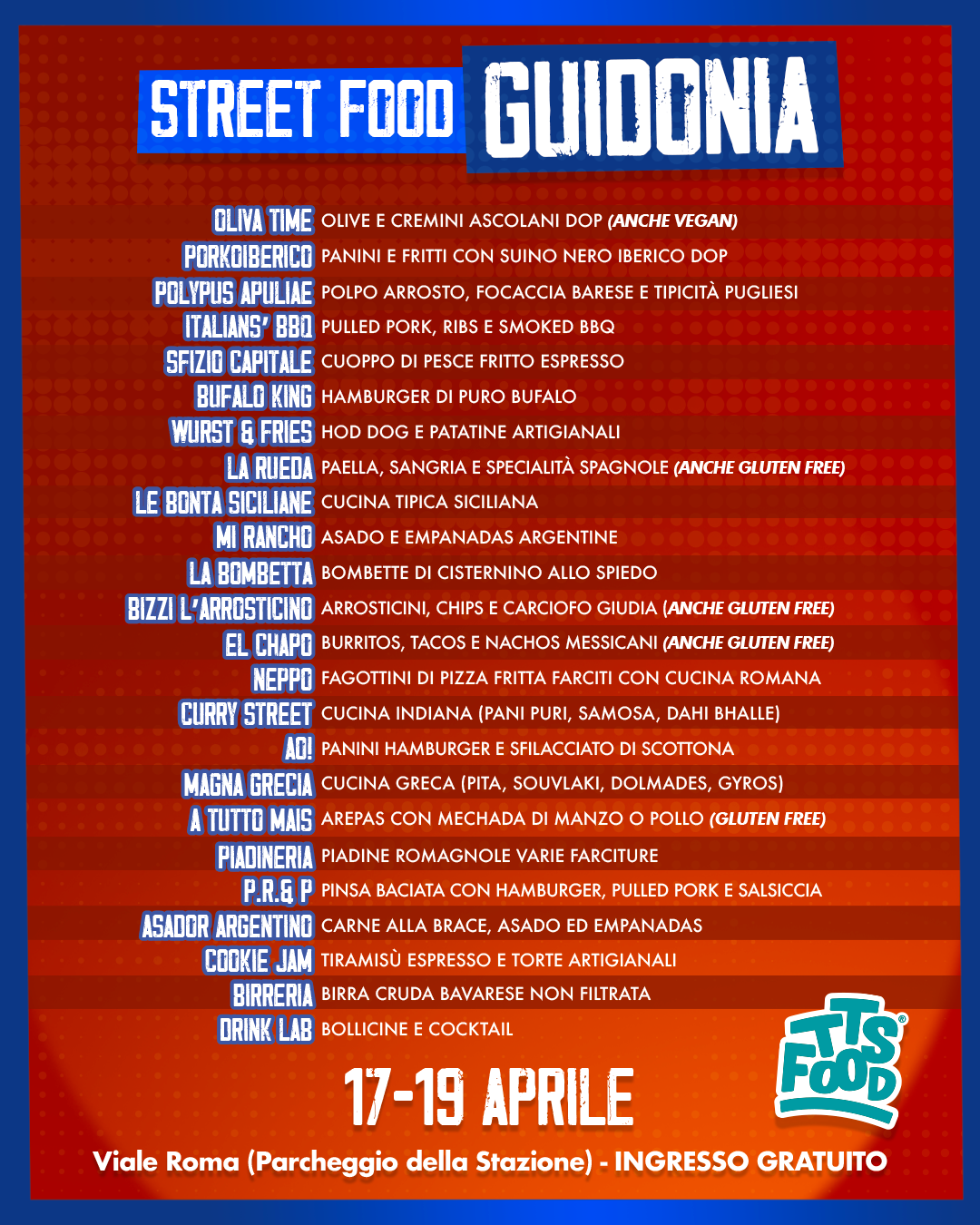 Dal 17 al 19 Aprile 2026, torna a Guidonia il TTS Street Food, dopo il grande successo della prima edizione che ha conquistato cittadini e visitatori.