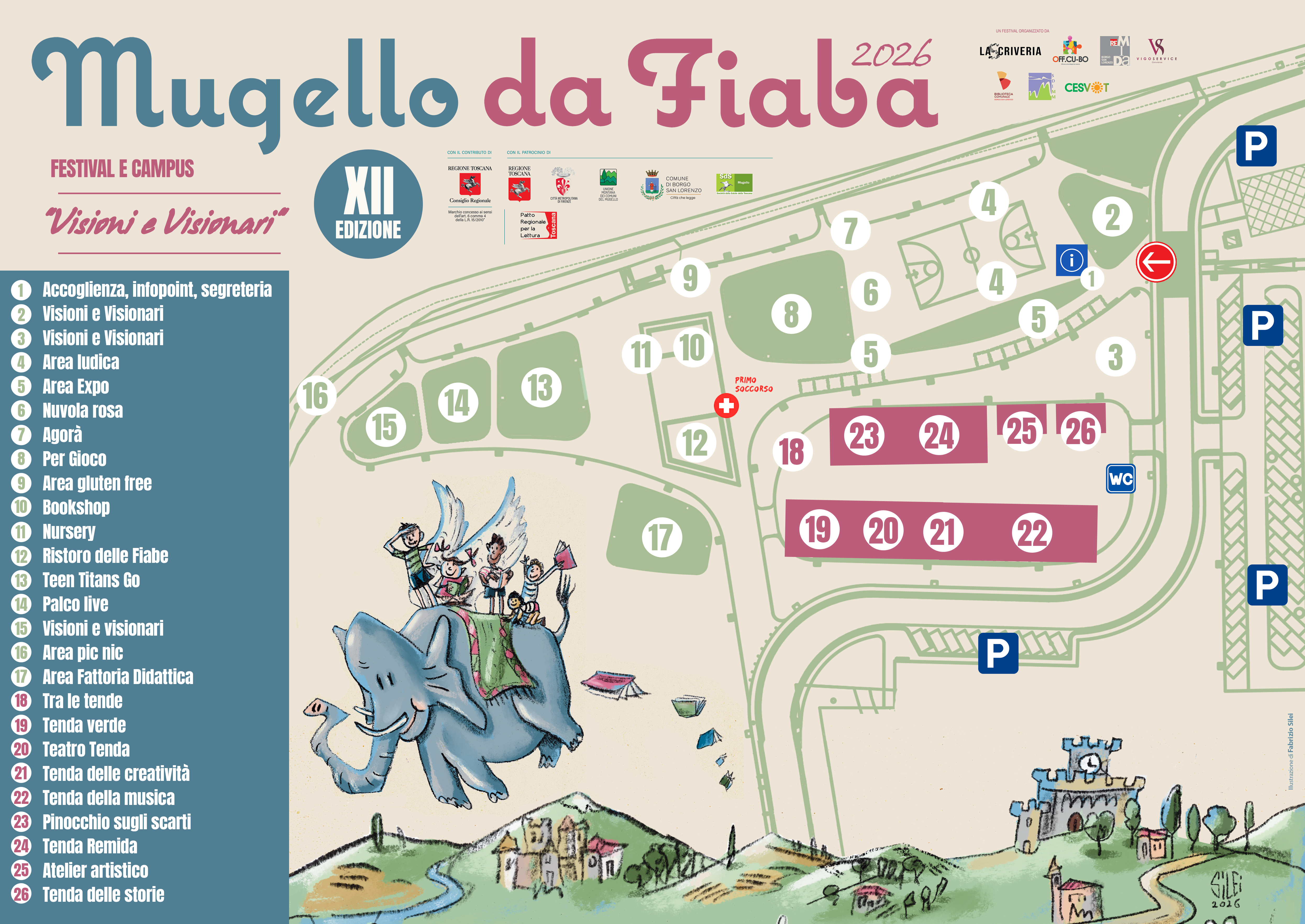 La principale novità di questa Edizione riguarda la location. Dopo alcuni anni in cui il cuore degli eventi è stato Piazza Dante, e in attesa della ristrutturazione di Villa Pecori Giraldi (storica sede della manifestazione), gli appuntamenti si sposteranno al Nuovo Foro Boario, uno spazio polifunzionale recentemente riqualificato dal Comune di Borgo San Lorenzo. Ed è qui che prenderà corpo questa nuova “visione” di Festival, proprio sul filo conduttore di quest’anno: “Visioni e Visionari”. A fare da cornice al tema di quest’anno sarà anche l’illustrazione ufficiale, realizzata dall’illustratore Fabrizio Silei, premio Andersen, che sarà presente al festival anche in qualità di autore ospite.