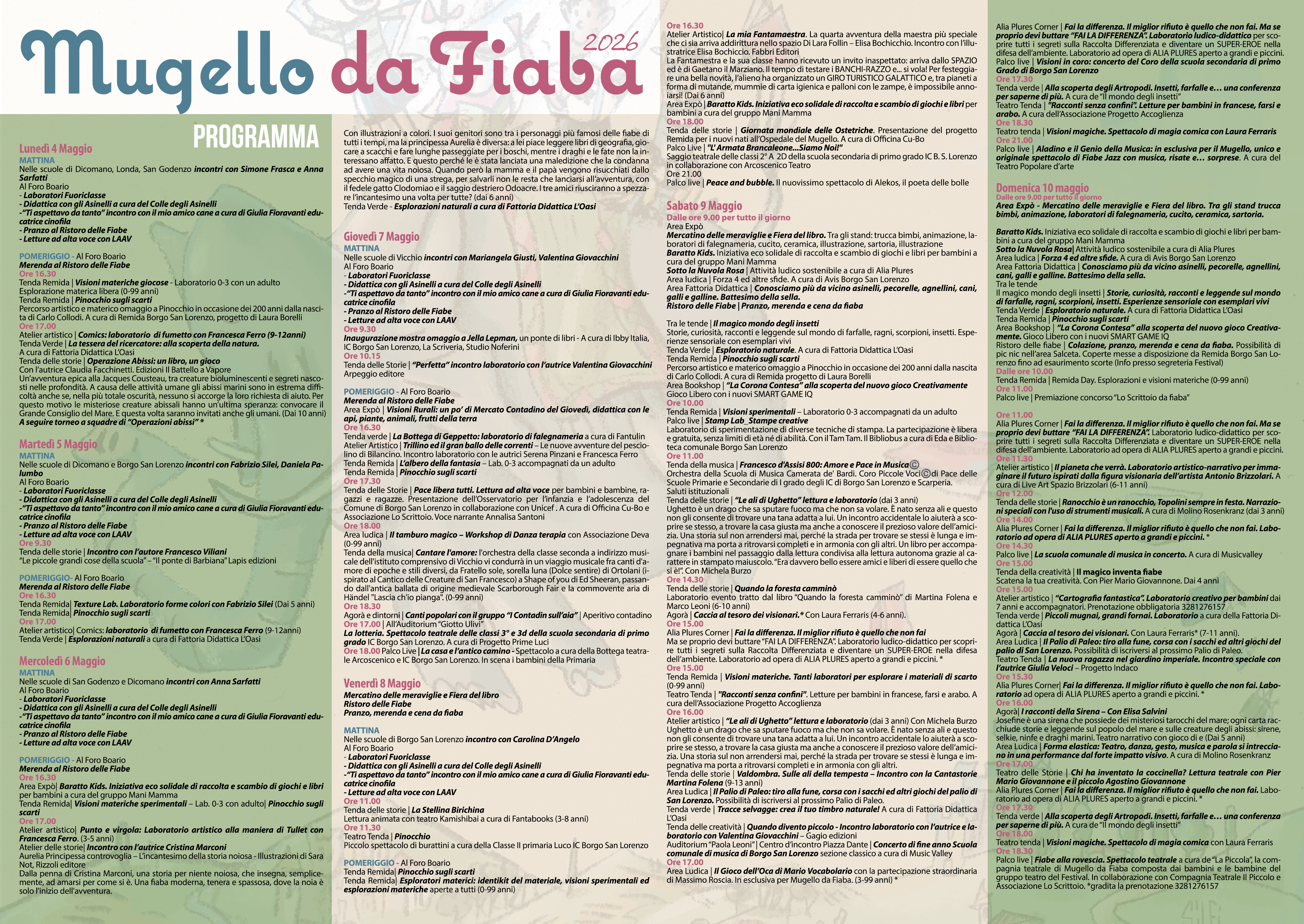 Da Giovedì 7 Maggio, invece, il Festival entrerà nel vivo con ancora più iniziative aperte a tutti, grandi e piccoli. Da segnalare in particolare l’Omaggio a Collodi con l’installazione gioco di Remida su progetto di Laura Borelli “Pinocchio sugli Scarti”, la bellissima mostra “Un ponte di libri” dedicata a Jella Lepman, l’unico e originale Gioco dell’Oca gigante di Mario Vocabolario con il fantastico Massimo Roscia, lo strepitoso spettacolo di “Fabe Jazz” di Sabato 9 Maggio in esclusiva per Mugello da Fiaba e il debutto, Domenica 10 Maggio, della “Piccola Compagnia Teatrale” di Mugello da Fiaba, interamente composta da bambini e bambine, con lo spettacolo “Fiabe alla Rovescia”.